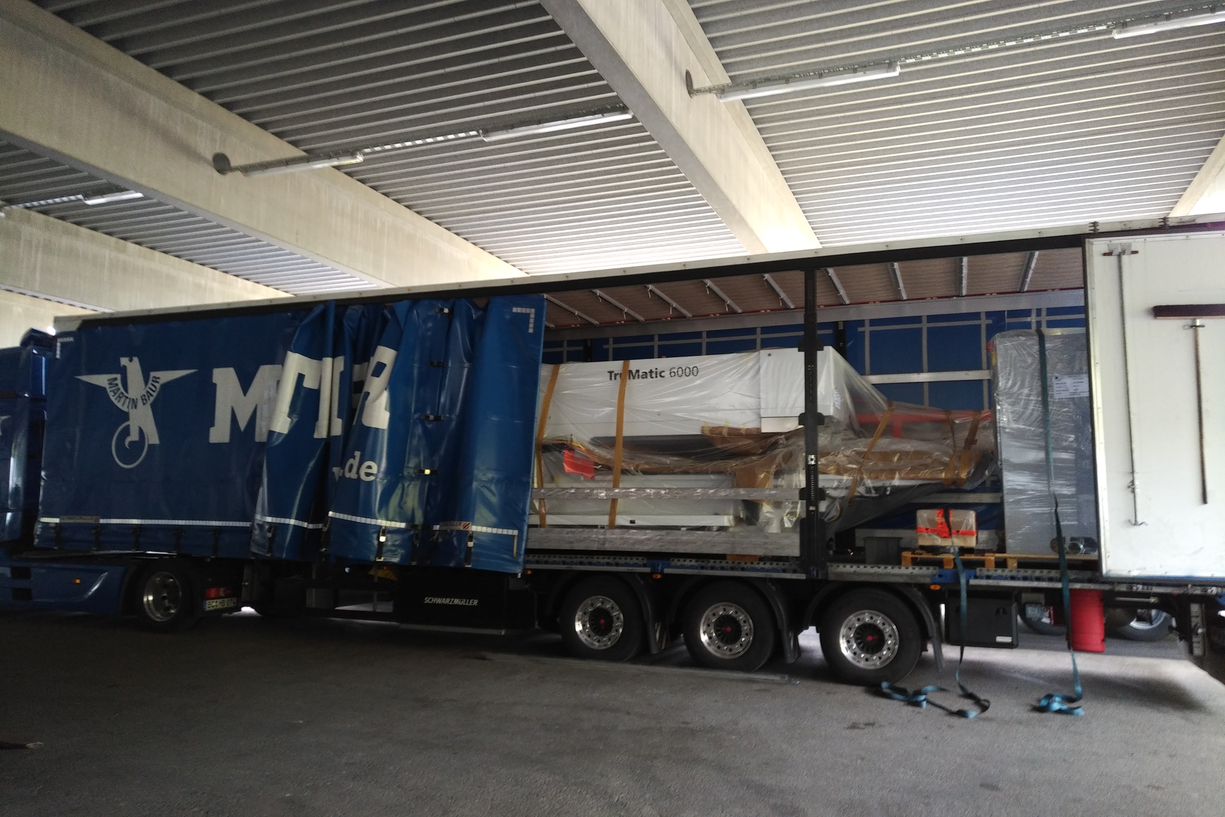 Was hier so unscheinbar und noch etwas schüchtern hinter der LKW-Plane hervor lugt, ist der jüngste Neuzugang zu unserem Maschinenpark. Am vergangenen Mittwoch war es soweit und wir durften in den frühen Morgenstunden unsere neue Trumatic 6000 Stanz-/Laser-Kombianlage von Trumpf auf unserem Firmengelände in Empfang nehmen.